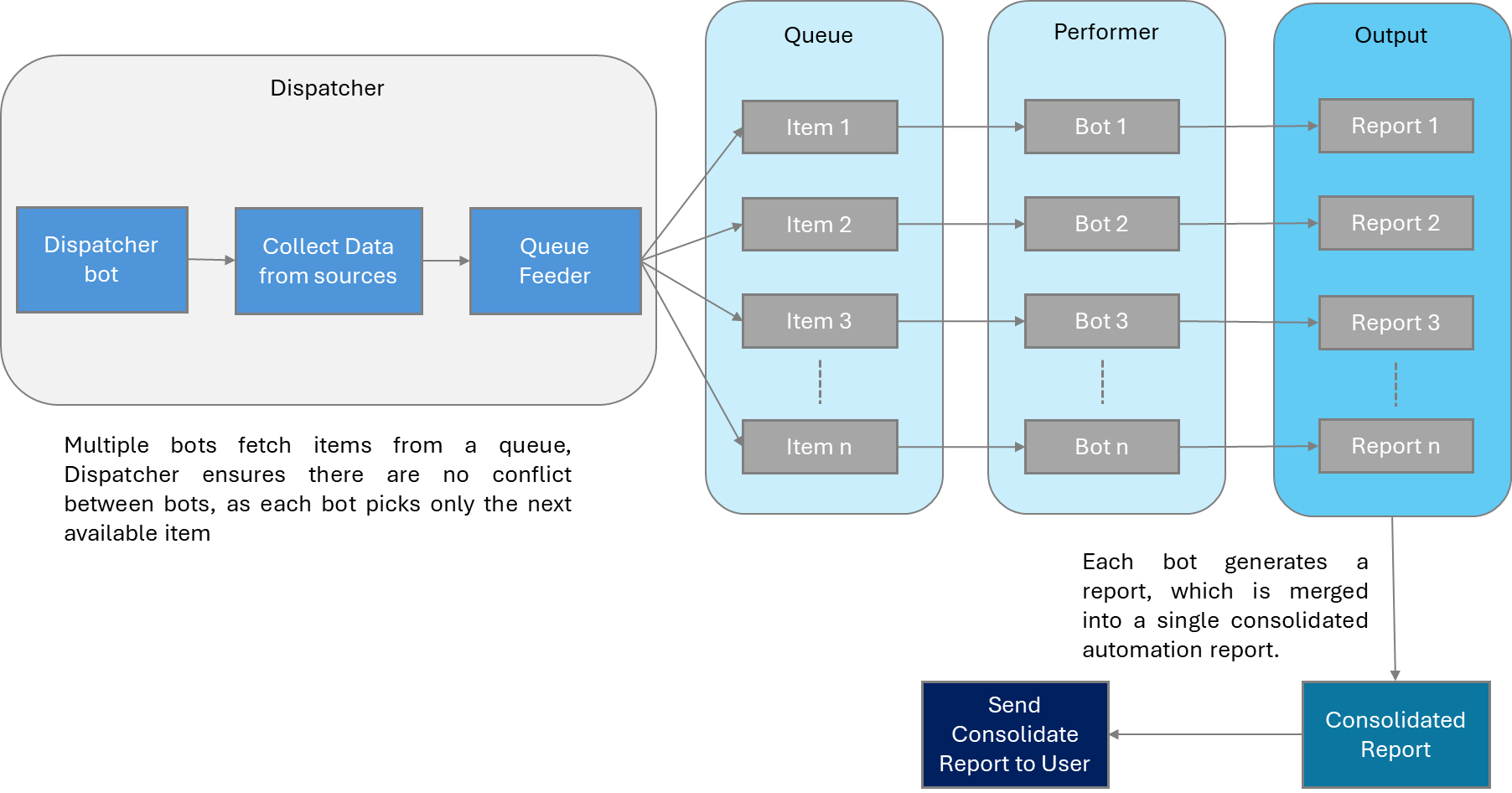 The graphic in Figure 1 represents a typical multi-bot architecture deployment for a report generation process. The Dispatcher collates the data from various sources and pushes it into a queue. This queue is operating on a first in first out basis. Each bot picks up an item on the queue and executes the task. The performer is responsible for the performance of the overall process and ensures that the load is balanced for optimum performance. Each bot generates its output in this case its then consolidated to generate a single report. This is an example of parallel bot execution.